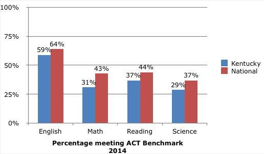 Despite creating a “rigorous” college and career ready program, high school students are hardly reaching ACT benchmarks. In 2014, only 62% of graduates were college or career ready. In that same year, only 59% of graduates made the ACT English benchmark, 37% for Reading, 31% for Math and only 29% for Science. Only 19% of graduates reached the benchmark in all subjects. Kentucky is below the national average on every single benchmark. With an average composite score of 19.9, Kentucky finds itself above only 7 states. In 2013, 89% of Kentucky’s ACT-tested graduates aspired to enroll in postsecondary education. However, only 55% did enroll from that graduating class.
