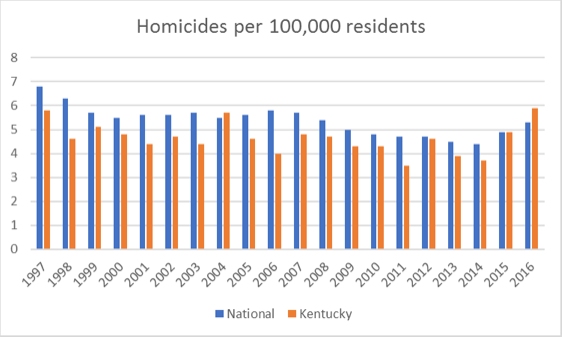 Overall, Kentucky’s murder rate jumped from 4.7 per 100,000 residents in 2015 to 5.9 per 100,000 in 2016. That’s above national average – 5.3 per 100,000 residents – for just the second time since 1997.