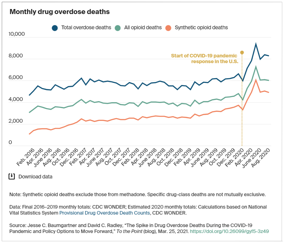 The increase in overdose deaths aligns neatly with the start of the pandemic. The pandemic likely fueled at least some of the increase in overdose deaths because of the increased social isolation, mental distress and economic instability associated with it. Social isolation and the lack of access to the social networks traditionally used by those with addictions to stay sober, like church programs, outpatient programs, AA, and NA, have likely contributed to the increase in overdose deaths. Kentucky has also experienced staggering unemployment over the past year which is a recipe for relapse when coupled with isolation.